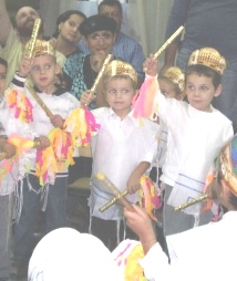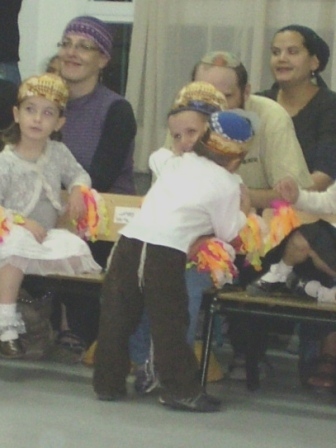Last night Betzalel had a Chunukah party at gan. he had a really good time danceing and seeing his friends. It was a bit strange seeing them at night, and being in gan in the dark. Betzalel dressed as a Maccabee, and marched around with the other boys. And they rebuilt the Beit Hamikdash. Betzalel put in his own block. They lit the Chunukiyah, and then we all ate.... guess what? DOUGHNUTS