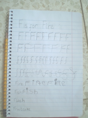 Oriel continues each night on his quest to read more and better and faster. Last night he started to read a book called "Ted in a red bed" Mummy read it through once, then he followed reading by himself aloud. He then continued with his writting practice where todays letter of choice was the letter "F". Which he wrote briliantly.